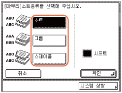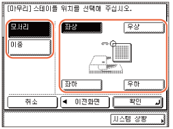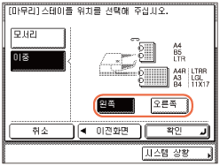 [스테이플]을 선택하는 경우 [다음화면]을 누르고 → 스테이플 종류([모서리] 또는 [이중])를 선택합니다.