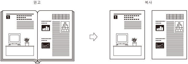 책이나 제본된 원고를 양면 복사하려면 분할복사 - 양면 모드를 사용하십시오. (분할복사 - 양면 복사)