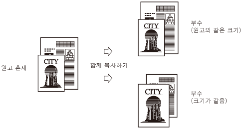 원고 혼재 모드를 단면에서 양면 모드와 함께 사용하고 양면 복사물 앞뒤면의 원고 크기가 다른 경우 복사물은 각 크기의 용지에 단면 복사로 출력됩니다.