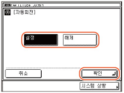 자동 회전을 '설정'으로 지정한 경우 기기는 원고 크기 및 복사 배율 등과 같은 정보를 사용하여 용지 크기에 가장 적합한 방향을 결정한 다음 필요하면 이미지를 자동으로 회전합니다. 이 모드가 자동 용지 선택 모드와 함께 설정된 경우 방향과 상관 없이 기기에서 사용할 최적 용지를 자동으로 선택합니다. (자동 용지 선택)