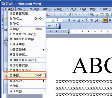 응용 프로그램에서 인쇄할 문서를 열고 [파일] 메뉴를 클릭한 다음 → [인쇄]를 선택합니다.