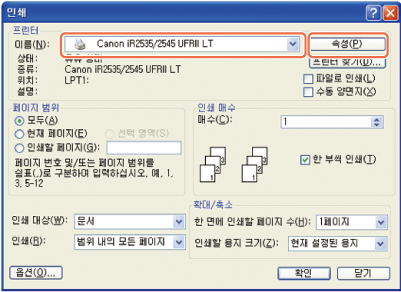 [인쇄] 대화상자에서 프린터를 선택하고 → [속성]*을 클릭합니다.