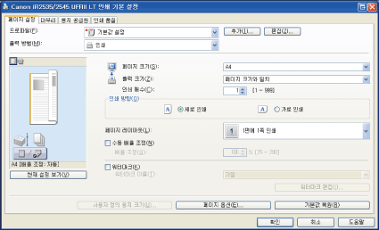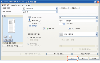 프린터 설정 대화상자의 각 시트에서 필요한 인쇄 설정을 지정하고 → [확인]을 클릭합니다.