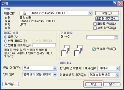 필요에 따라 인쇄 부수와 인쇄할 페이지를 지정하고 → [확인]을 클릭합니다.*