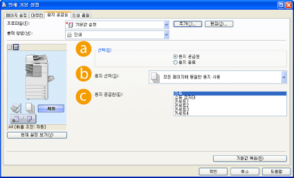 * <선택>에서 [용지 종류]를 선택하는 경우 [용지 공급원] 대신에 [용지 종류]가 표시되어 문서를 인쇄할 용지 종류를 선택할 수 있습니다.