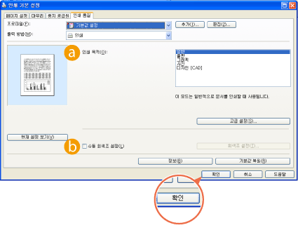각 시트에서 설정을 지정한 후에는 [확인]을 클릭하여 [인쇄] 창으로 돌아갑니다.