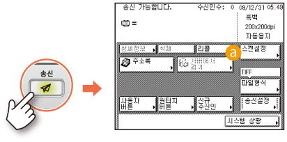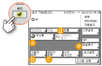 (송신)을 누를 때 처음 표시할 화면을 지정할 수 있습니다. 사용자 버튼 화면, 원터치 화면 또는 송신 및 팩스 기능의 시작 화면을 처음 표시할 화면으로 선택할 수 있습니다.
