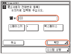 - (숫자 키)를 사용하여 전화번호(최대 20자리)를 입력하고 → [확인]을 누릅니다.