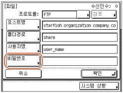 <SMTP 인증 설정>에서 <인증 방법>의 설정이 인증 화면을 표시하도록 구성된 경우 (시작)를 누를 때 네트워크 비밀번호 입력 화면이 나타납니다. (사용자 설정) 사용자명 및 비밀번호를 지정하고 → [확인]을 누릅니다.