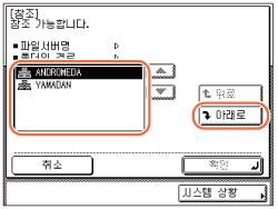 지정한 파일 서버의 특정 폴더로 스캔한 문서를 보내려면 [아래로]를 누르고 → 원하는 폴더를 선택한 후 → [확인]을 누릅니다.