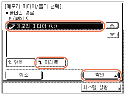 선택한 미디어의 특정 폴더에 스캔한 문서를 저장하려면 [아래로]를 누르고 → 원하는 폴더를 선택한 후 → [확인]을 누릅니다.