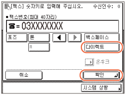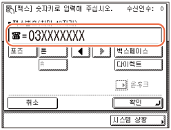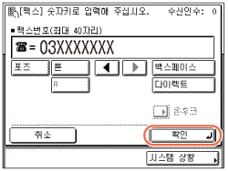 송신 기능 제한에서 [입력된 팩스 번호 확인]을 '설정'으로 지정한 경우 확인을 위해 팩스 번호를 다시 입력해야 합니다. 3단계에서 입력한 팩스 번호를 입력하고 → [확인]을 누릅니다. (송신 기능 설정)