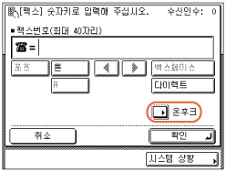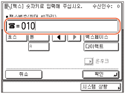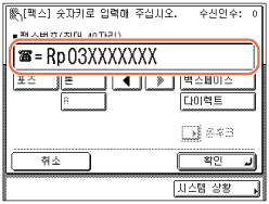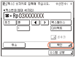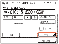 송신 기능 제한에서 [입력된 팩스 번호 확인]을 '설정'으로 지정한 경우 확인을 위해 팩스 번호를 다시 입력해야 합니다. 5단계에서 입력한 팩스 번호를 입력하고 → [확인]을 누릅니다. (송신 기능 설정)
