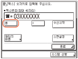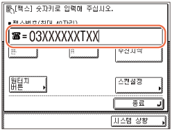 - (숫자 키)를 사용하여 팩스 번호(최대 40자리)를 입력합니다.