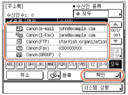 주소록 목록에서 수신인을 선택하고 → [확인]을 누릅니다.