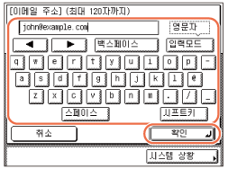주소록을 사용하여 원하는 수신인을 선택하거나 - (숫자 키) 또는 화면 표시 키보드를 사용하여 수신인의 주소를 한 자리씩 입력합니다.