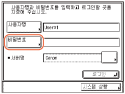 <파일을 주소록에 등록된 주소로 송신할 때>의 설정이 인증 화면을 표시하도록 구성된 경우 (시작)을 눌러 문서를 파일 서버로 송신할 때 네트워크 비밀번호 입력 화면이 나타납니다. (사용자 설정) 사용자명 및 비밀번호를 지정하고 → [확인]을 누릅니다.