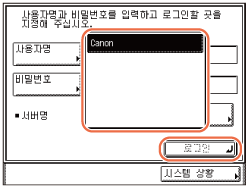 <SMTP 인증 설정>에서 <인증 방법>의 설정이 인증 화면을 표시하도록 구성된 경우 (시작)를 누를 때 네트워크 비밀번호 입력 화면이 나타납니다. (사용자 설정) 사용자명 및 비밀번호를 지정하고 → [확인]을 누릅니다.