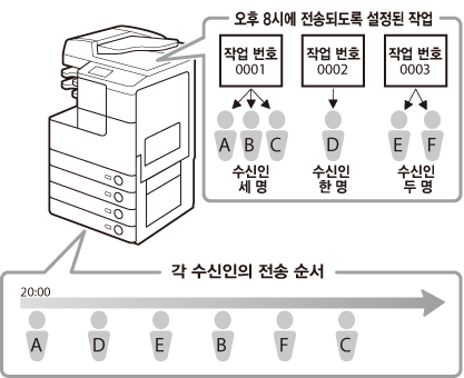 여러 송신 작업이 예약 송신 시간에 동시에 도달한 경우 다음과 같은 순서로 문서가 송신됩니다.