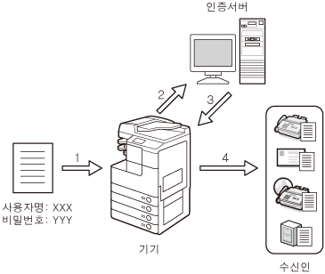 네트워크에서 Active Directory 등 디렉토리 서비스를 사용하는 경우 인증된 송신도 사용하는 것이 좋습니다. 인증된 송신은 권한이 없는 사용자가 문서를 기기에서 송신하는 것을 방지할 수 있도록 하는 인증 기능입니다. 이 기능이 활성화된 경우 문서를 송신하려는 사용자는 유효한 사용자 이름 및 비밀번호를 입력해야 합니다.