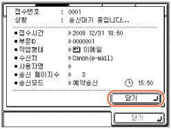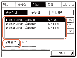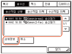 이 절에서는 현재 송신 중이거나 송신 대기 중인 문서에 대한 상세 정보를 확인하는 방법과 필요에 따라 이러한 문서를 삭제하는 방법에 대해 설명합니다. 작업이 지정된 날짜 및 시간과 수신인 등 상세 정보를 확인할 수 있습니다.