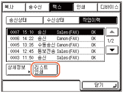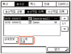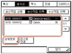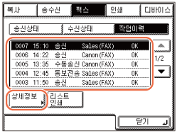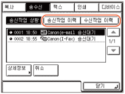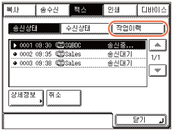 [송신작업 이력] 또는 [수신작업 이력]을 누릅니다.