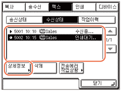 [시스템 상황] → [팩스] → [수신 작업 상황]을 누릅니다.