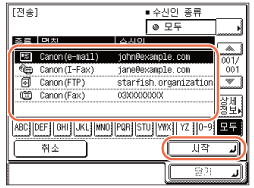 주소록에서 전송처를 선택하고 → [시작]을 누릅니다.