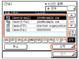 주소록에서 전송처를 선택하고 → [시작]을 누릅니다.