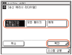 [첫 페이지와 에러 페이지], [모든 페이지] 또는 [해제]를 선택하고 → [확인]을 누릅니다.