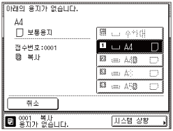 용지 카세트가 기기에 완전히 삽입되지 않은 경우에도 위의 화면이 나타납니다.