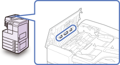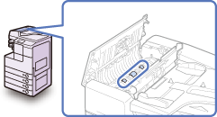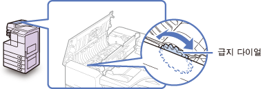 피더가 열려 있는 상태에서 급지 다이얼에 접근할 수 없으면 피더를 닫고 → 급지 다이얼을 살짝 돌린 다음 → 피더를 열고 → 롤러를 청소합니다. 롤러 표면이 완전히 깨끗해질 때까지 이 단계를 반복합니다.