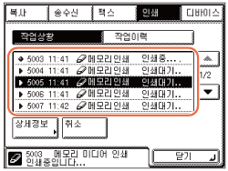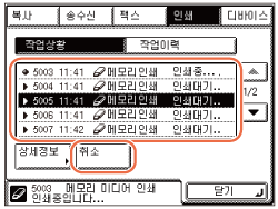 본 절에서는 (중지)와 시스템 상황 화면을 사용하여 인쇄 작업을 취소하는 방법과 시스템 상황 화면을 사용하여 인쇄 작업에 대한 상세 정보와 기록을 확인하는 방법에 대해 설명합니다.