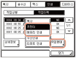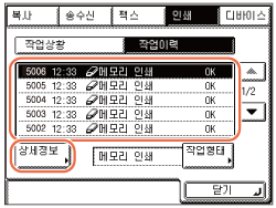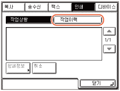 시스템 관리설정의 작업 이력 표시를 "해제"로 설정한 경우 인쇄 이력 화면이 시스템 상황 화면에 표시되지 않습니다. 작업 이력 표시를 설정하는 방법에 대한 자세한 내용은 기기를 무단 액세스로부터 보호를 참고하십시오.