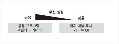 기기의 터치 패널 화면을 사용하거나 응용 프로그램 또는 프린터 드라이버의 설정을 지정하여 특정 설정을 지정할 수 있는 경우 프린터 드라이버의 설정을 기기의 터치 패널 화면에서 지정한 설정보다 우선합니다.
