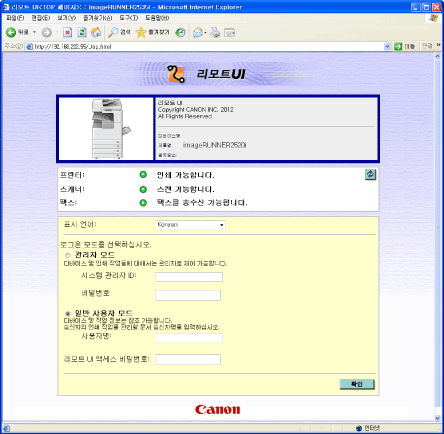 리모트 UI 시작 페이지의 모양은 기기에 적용된 관리 모드에 따라 달라집니다. 자세한 내용은 부문별 ID 관리 및 사용자 관리 설정을 참고하십시오.