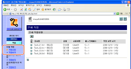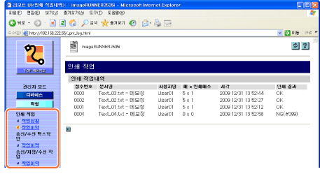 인쇄 작업 페이지에는 기기에서 이미 처리된 작업의 리스트가 표시됩니다.