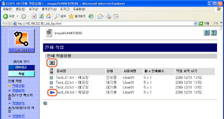 인쇄 작업을 삭제하려면 삭제할 작업 옆에 있는 [