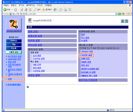 1단계에 표시된 페이지에서 [TCP/IP 설정]을 클릭합니다.