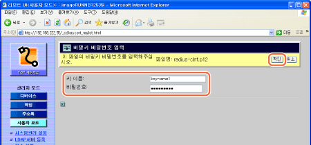 키 및 인증서 설치 및 등록의 1단계 스크린 샷을 참고하십시오.