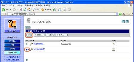 IEEE802.1X 포트 기반 인증의 경우 클라이언트 장치에서 EAP-TLS 방법을 설정하려면 PKCS#12 형식으로 된 키 페어 또는 개인 키와 증명서가 필요합니다. 웹 브라우저(리모트 UI)에서 안전하게 기기에 접속하길 원할 경우 키 페어를 생성하고 TLS 통신을 설정합니다. 최대 3개 키 페어를 등록할 수 있습니다.