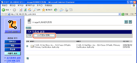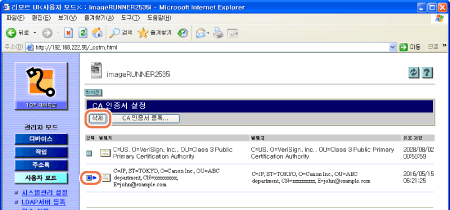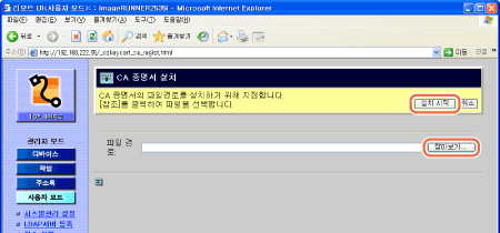 아래 설명된 대로 기기에 CA 인증서를 설치합니다. 또한 CA 인증서를 등록하거나 불필요한 인증서 파일을 삭제할 수도 있습니다.
