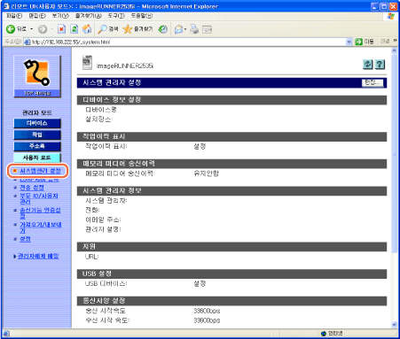 [사용자 모드] → [사용자 모드] 메뉴의 [시스템관리 설정]을 클릭합니다.