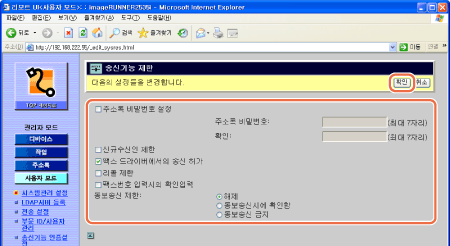 시스템 관리 설정 편집 페이지에 표시된 [송신 기능 제한]을 클릭합니다.