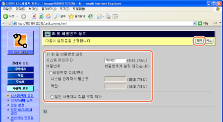 시스템 관리 부문 ID와 시스템 관리 비밀번호는 제품 구입 시 둘 다 "7654321"로 설정되어 있습니다. 기기를 사용하기 전에 이 ID와 비밀번호를 변경하십시오.