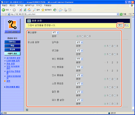 (사용자 모드)를 눌러 기기의 조작부에서 사용자 모드 설정에 액세스할 수 있습니다.음량 설정에 대한 자세한 내용은 기본 사용법을 참고하십시오.