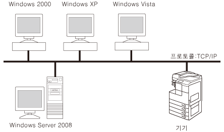 위의 네트워크 연결 다이어그램 예는 Windows 기반의 네트워크 환경을 보여줍니다. 기기는 Windows 전용 환경에서 가장 잘 작동하지만, Windows, UNIX, Linux, Mac OS X를 비롯한 서로 다른 운영 체제의 네트워크에서 사용될 수도 있습니다. ( 시스템 요구사항)