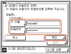 [비밀번호]를 누르고 → 화면 키보드를 사용하여 개인 키(최대 24자)의 비밀번호를 입력한 다음 → [확인]을 누릅니다.