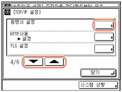 [TCP/IP 설정]을 누르고 → [증명서 설정]이 나타날 때까지 [] 또는 []를 누른 후 → [증명서 설정]을 누릅니다.