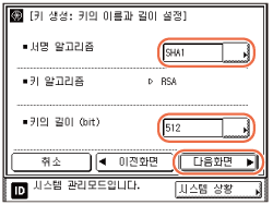 키 길이 드롭다운 리스트를 누르고 → 원하는 키 길이(비트로 표시)를 선택하기 위해 [512], [1024], [2048] 또는 [4096]을 누릅니다.